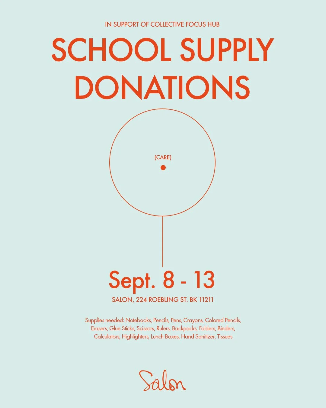 Join us in supporting Collective Focus Hub’s back-to-school drive. We are accepting the following school supply donations at SALON now through Saturday 9.13.