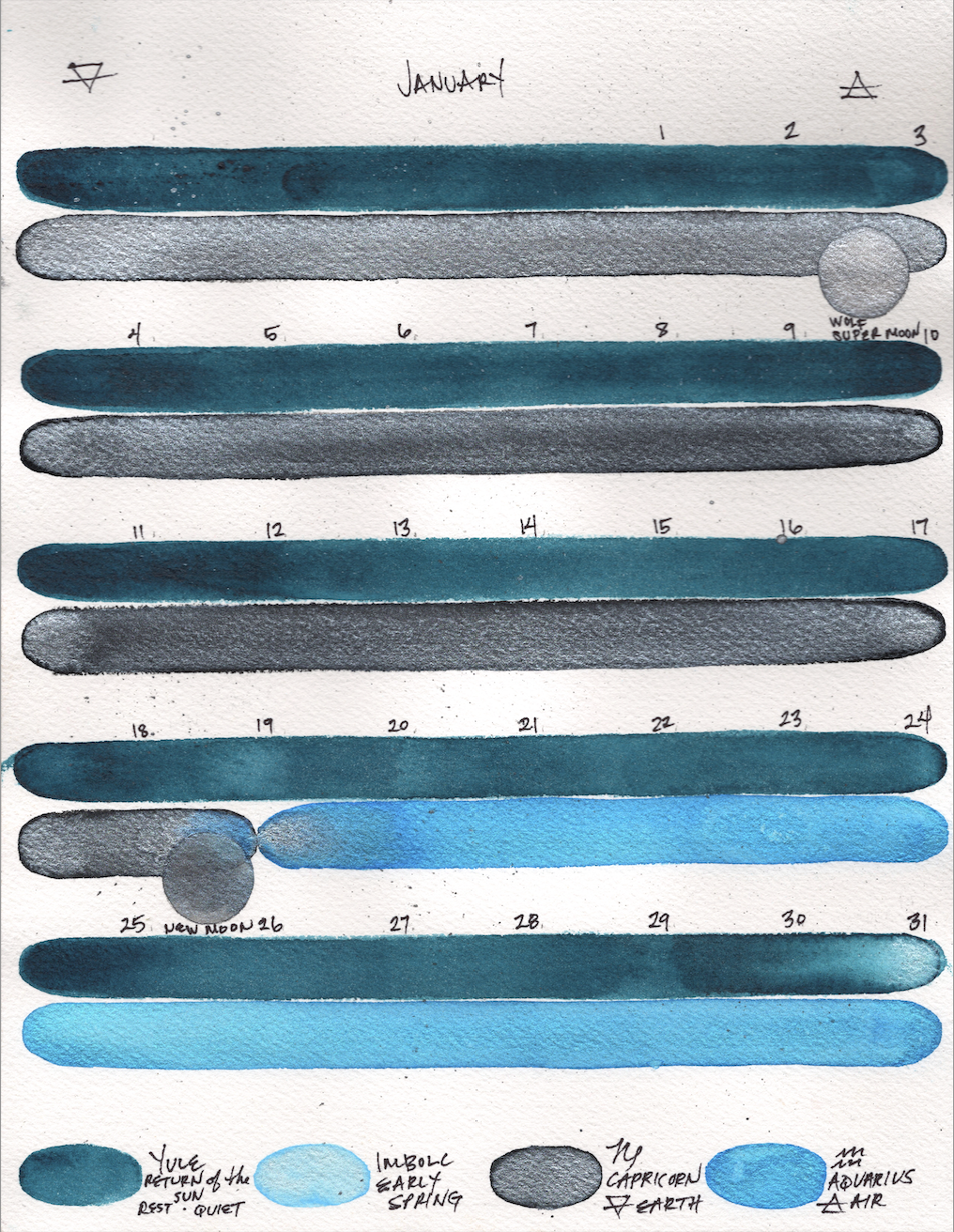 This calendar began with a feeling that the modern calendar, the one shaped by the demands of commerce and productivity, can stretch and shrink our time. It organizes our lives in ways that sometimes pull us away from natural rhythms and distribute our attention across deadlines and obligations.